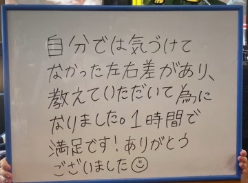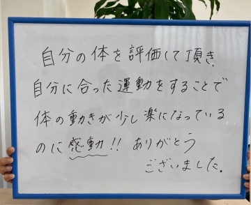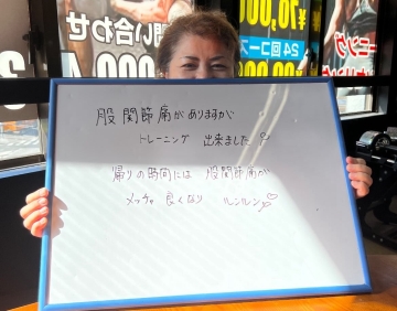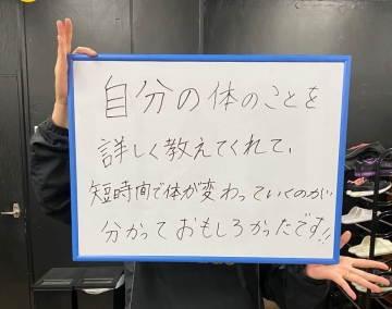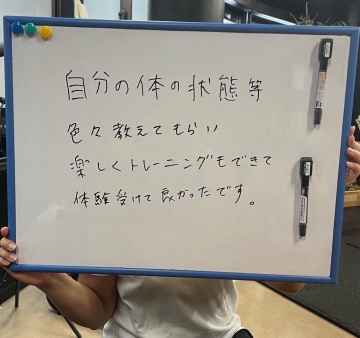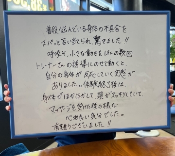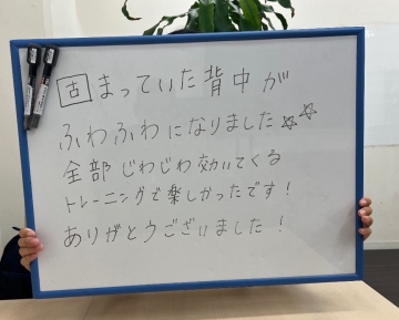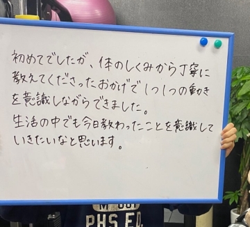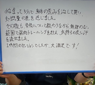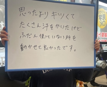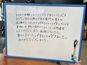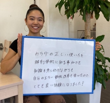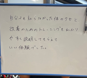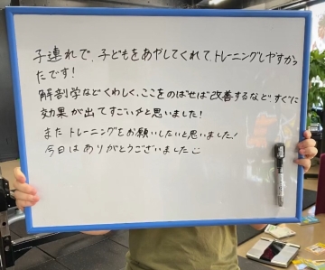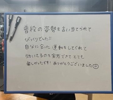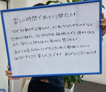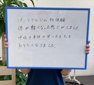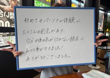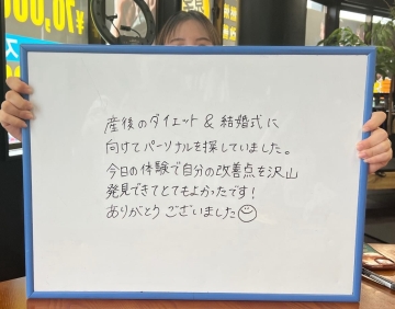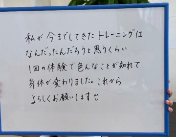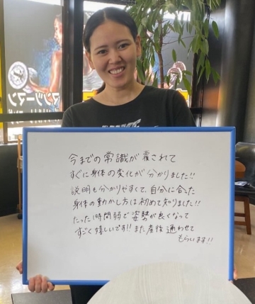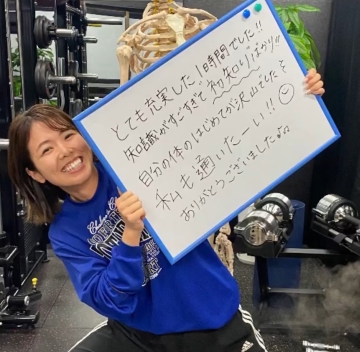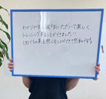 ダイエット目的ではじめてこちらのパーソナルジムに通いました。最初は不安でしたが、体重は落ち、姿勢なども見てくれて、あまり伝えてなかった腰痛や肩こりなどもジムに通う前に比べると改善できています。食事面でもこんなに食べて大丈夫なのと思いましたが数字しっかり落ち、見た目も気になってたウエスト周りや垂れたお尻が上がり満足です。