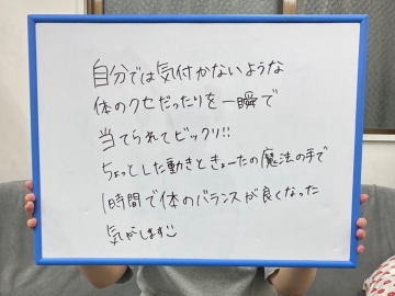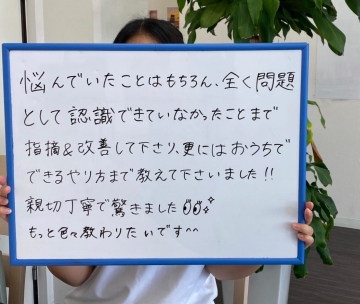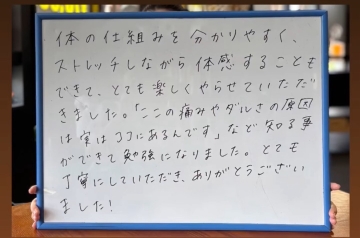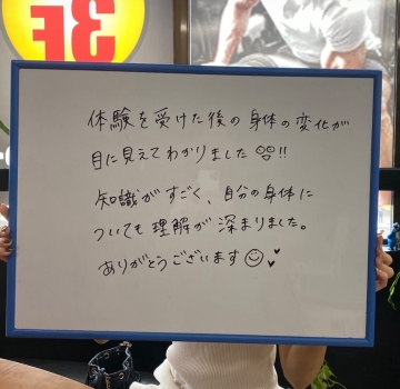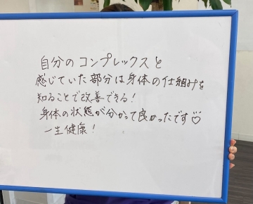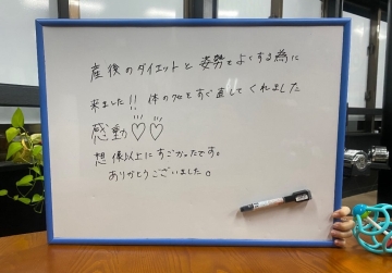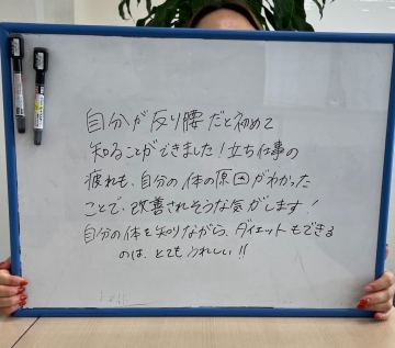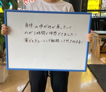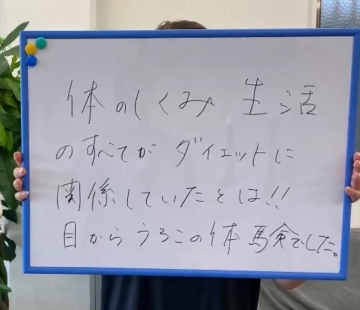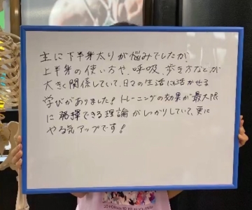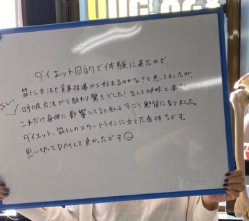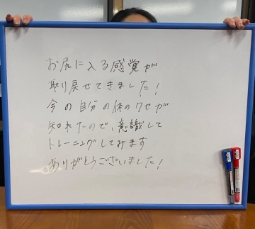 ダイエット目的で通い始めましたが、最初は続けられるか不安でした。体重が落ちるだけでなく、姿勢のチェックやアドバイスも丁寧で、伝えていなかった腰痛や肩こりまで改善して驚いています。食事管理も無理なく続けられ、気になっていたウエスト周りや下がっていたお尻も引き締まりました。数字も見た目も変わり、通って本当に良かったと思っています。