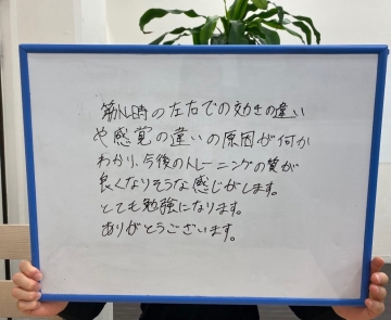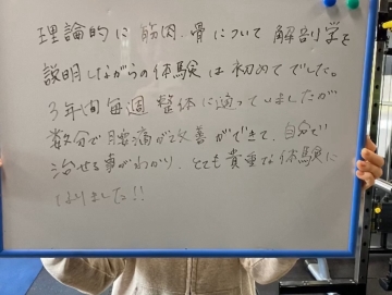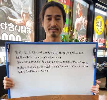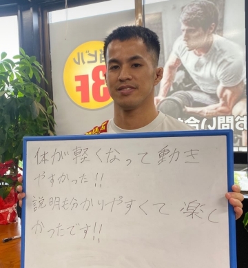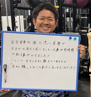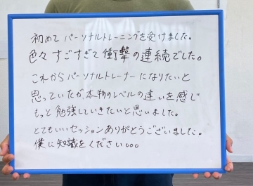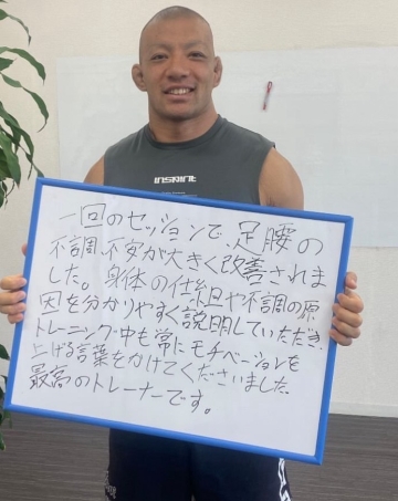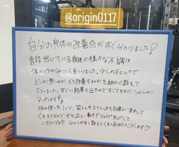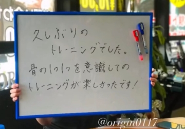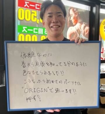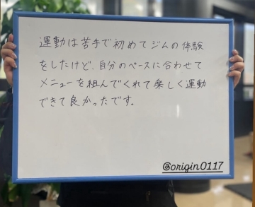 24hのジムに週4通っていましたが、思いの外見た目は変わらず体重変動も下がってはすぐに戻りを繰り返していました。思い切ってプロから学ぼうと個人指導されている「ORIGIN」さんに通うことに決めました。食事管理も自身がやってた時より厳しくなく、トレーニングも何故こうなるのか初心者の自分にも分かりやすく指導してくれました。24hジムに通う自分にとってはとても嬉しかったです。体脂肪率も3ヶ月で9%落ち、隠れた腹筋が見えてきました。また、楽しくジムに通えているので運動が生活の一部に入ってきて嬉しいです。来年は大会にもチャレンジしてみたいと思います!