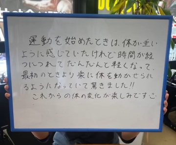 動くことが億劫になり体重も増えていましたが、孫と外で思い切り遊びたいと思い通い始めました。長く運動から離れていたため不安も大きかったですが、私に合わせて無理のないプログラムを組んでいただき、今では楽しく続けられています。体重以上に見た目の変化が嬉しく、自信も戻りました。孫と外で遊ぶ時間も増え、年明けには旅行を計画できるほど元気になりました。
